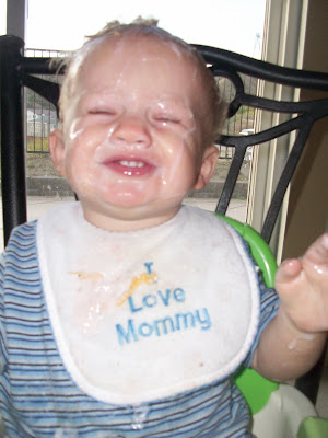 We've added forks to the growing list of utensils Luke is learning to use. The other day Luke was not interested in eating his dinner whatsoever. He was just pushing the food around on his plate but hadn't really eaten much. I wasn't ready to get him out of his seat, especially since he didn't really eat but just played with his food. So, I dug through the drawer where we keep his cups and things and found a fork- not just any fork, but a Broncos fork, and gave it to Luke. He was thrilled! He figured out how to push the pieces of food to the corner of his tray in order to pierce them with the fork and then bring them to his mouth! Smart little guy. He ended up eating everything on his tray and even more!